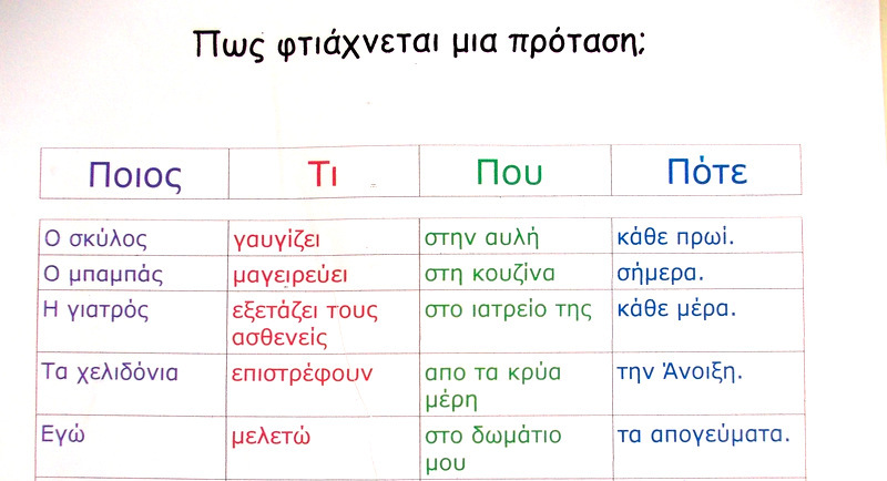 Άσκηση: Φτιάχνουμε προτάσεις τις οποίες χωρίζουμε σε 4 μέρη τη κάθε μια. Τα μέρη