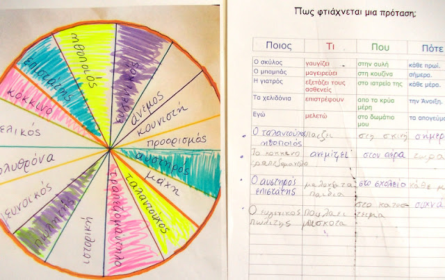 Και στο τέλος χωρίς το παραπάνω σχεδιάγραμμα το παιδί προσπαθεί να συντάξει στο τετράδιο του, μόνο του, προτάσεις που πρέπει να περιέχουν και τα 4 μέρη.