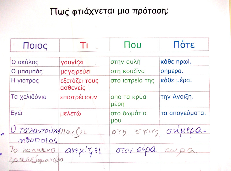 Και στο τέλος χωρίς το παραπάνω σχεδιάγραμμα το παιδί προσπαθεί να συντάξει στο τετράδιο του, μόνο του, προτάσεις που πρέπει να περιέχουν και τα 4 μέρη.